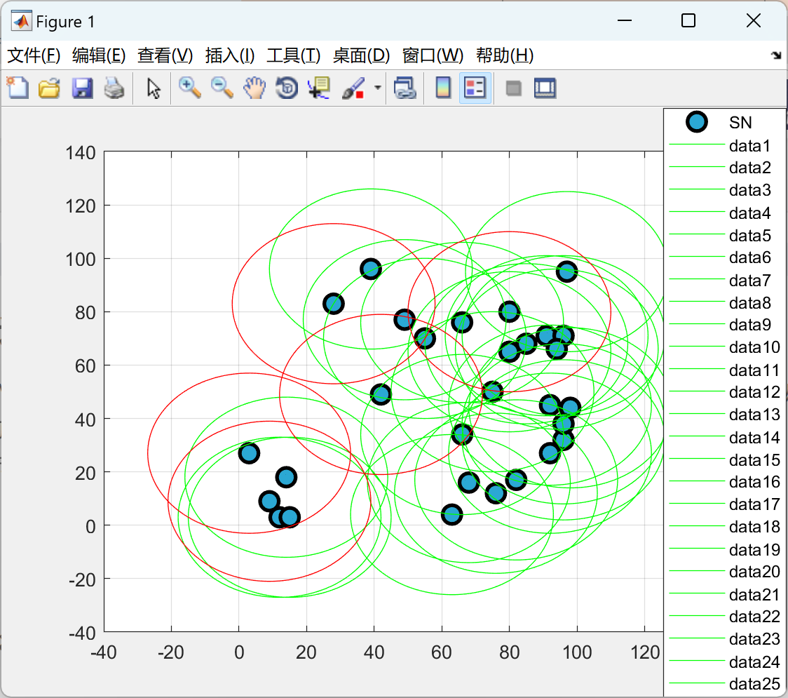 在无线传感器网络部署方面,您计划在一个 100 * 100 平方米的区域内部署无线传感器网络。每个传感器节点(SN)的射程范围为 30 米。在这个区域内,您共有 29 个传感器节点,其中 5 个是恶意节点。正版节点用绿色圆圈表示,而恶意节点用红色圆圈表示。您的目标是利用这个网络进行多种研究问题的研究,包括路由、覆盖范围、安全性和本地化等方面。