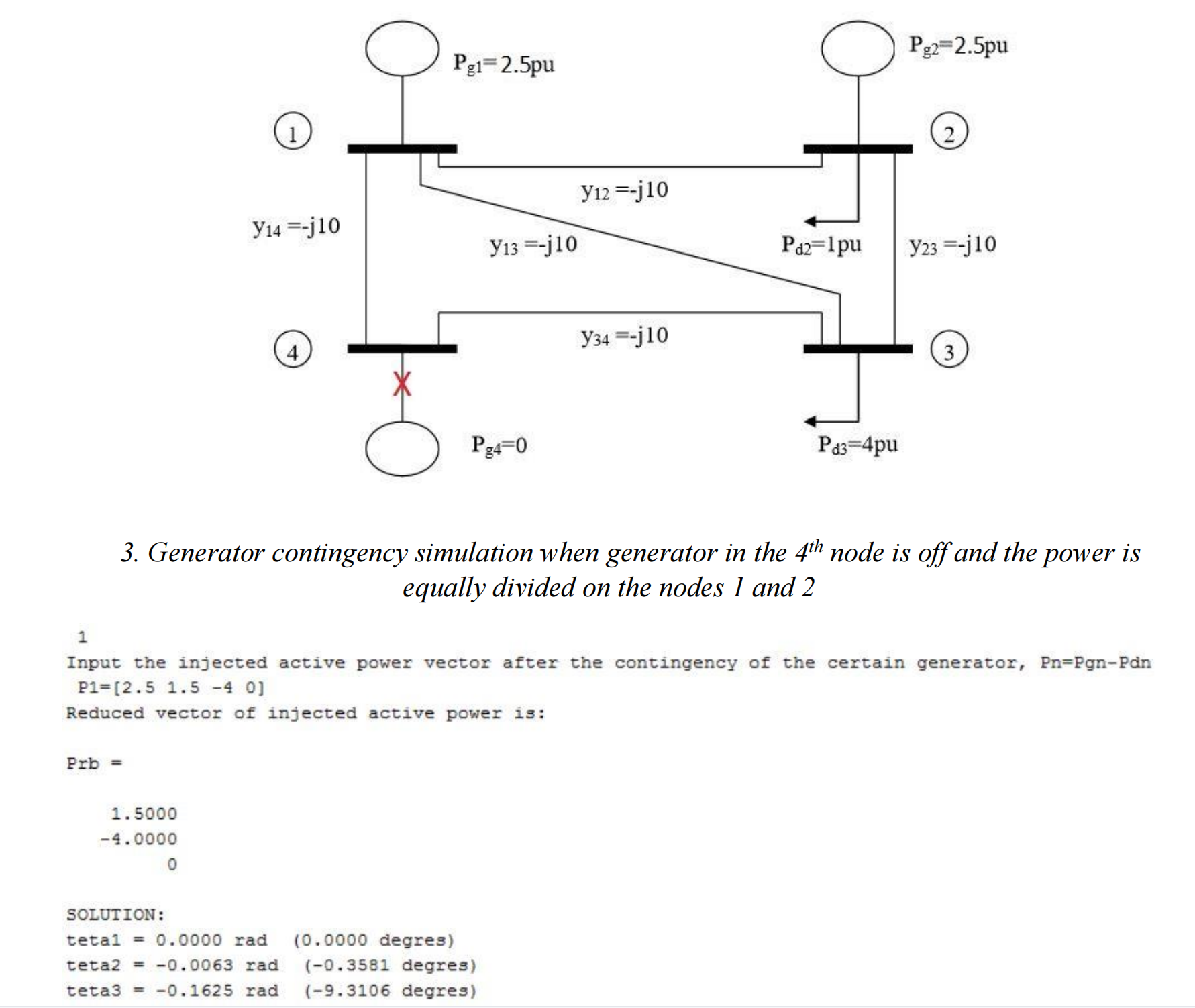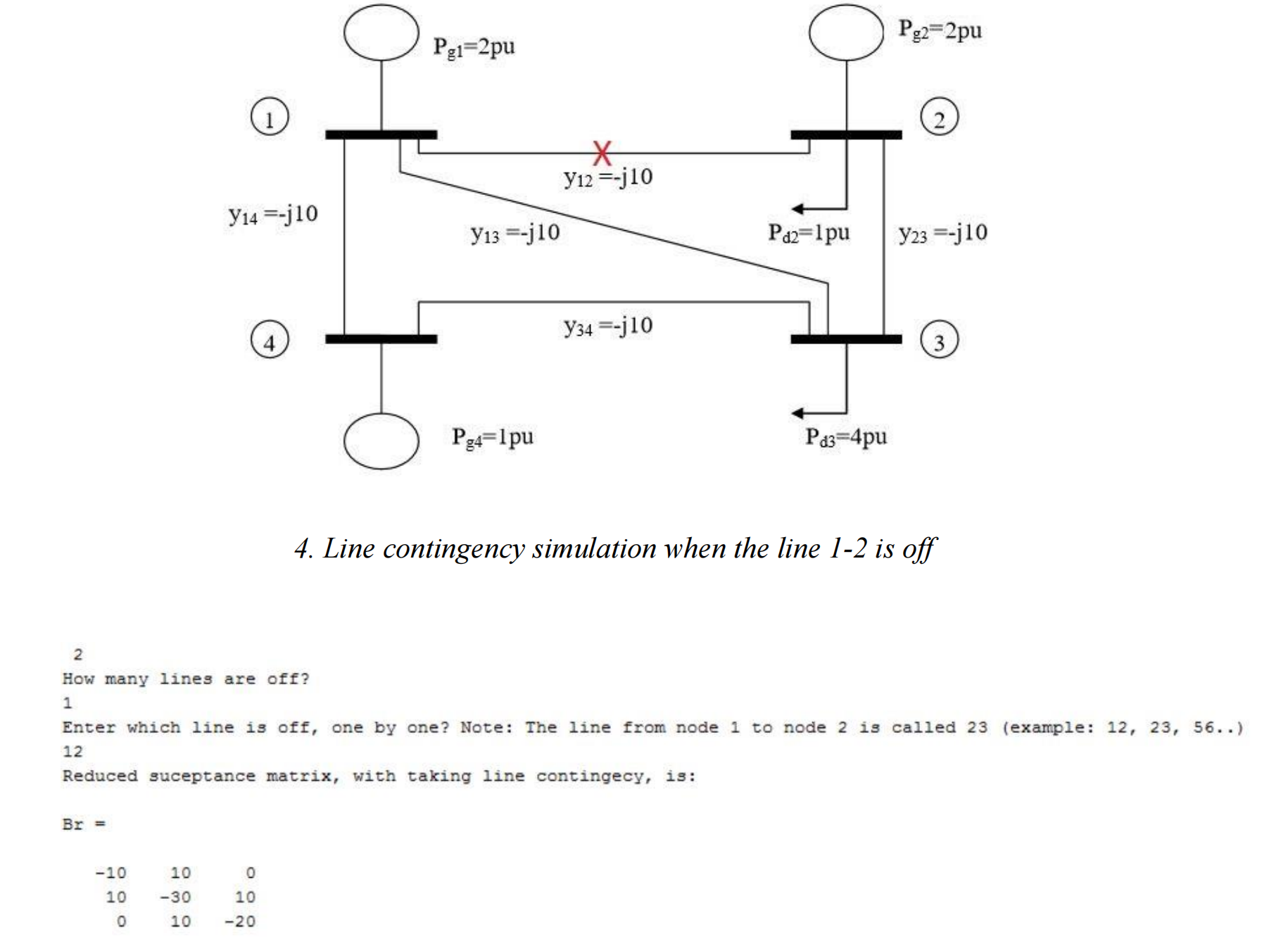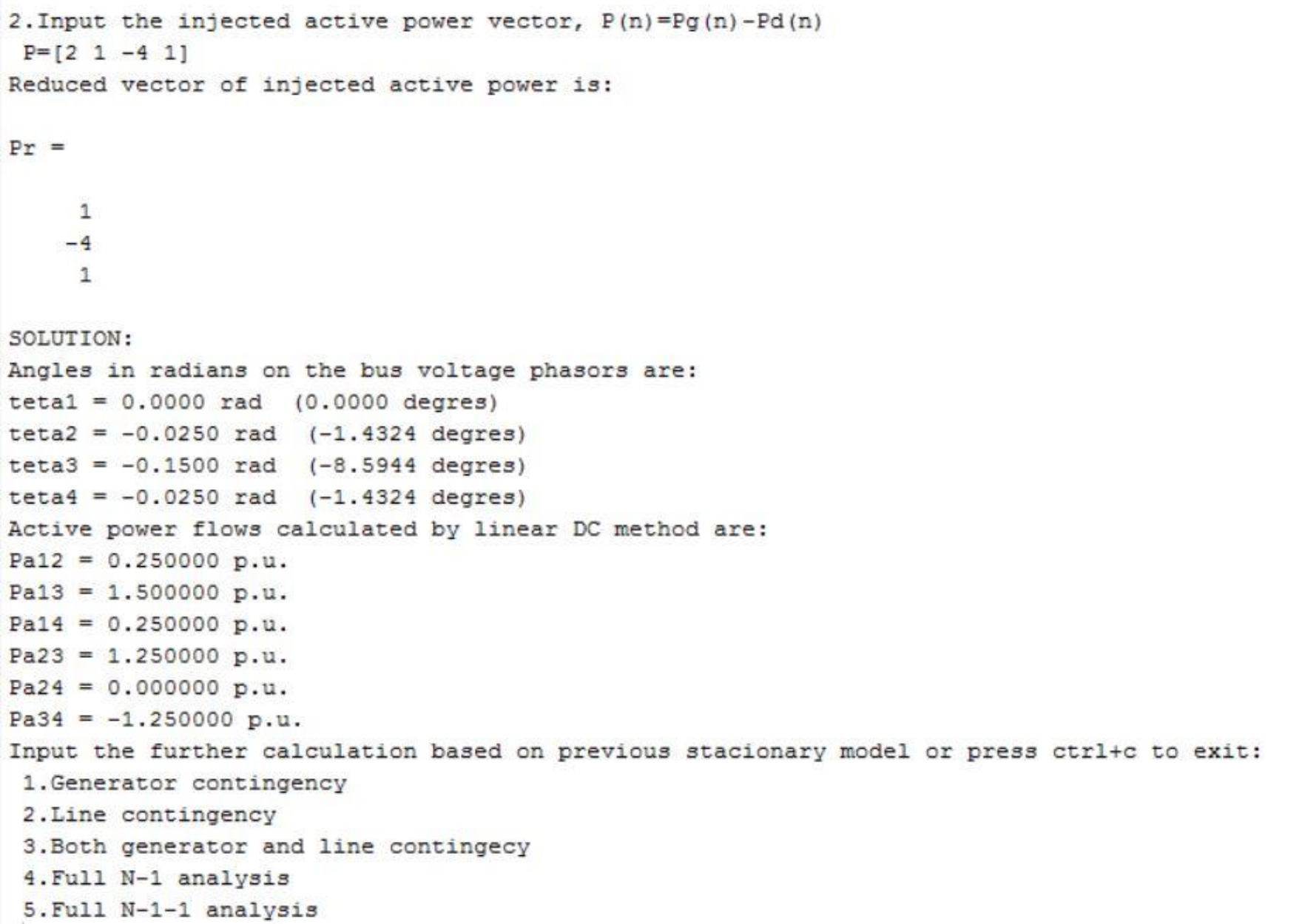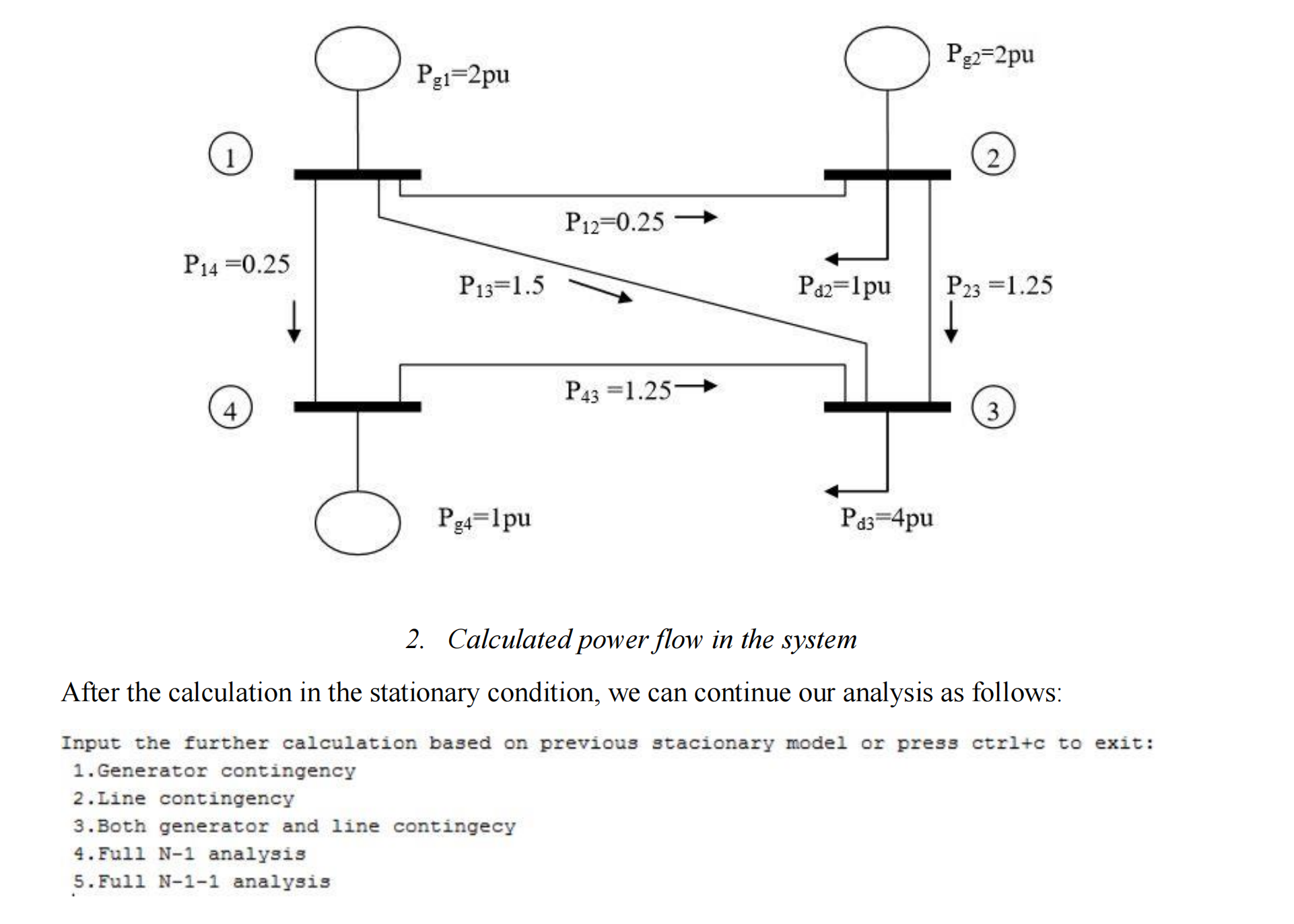 answer=input('Input the further calculation based on previous stacionary model or press ctrl+c to exit:\n 1.Generator contingency\n 2.Line contingency\n 3.Both generator and line contingecy\n 4.Full N-1 analysis \n 5.Full N-1-1 analysis \n ');