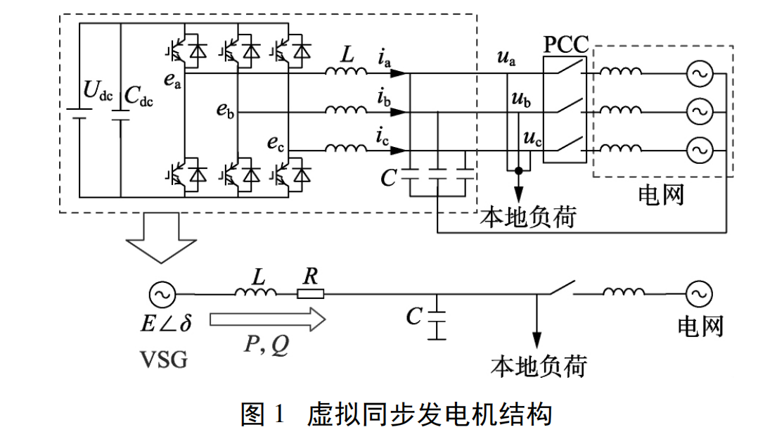 图 1 为虚拟同步发电机结构示意图,虚拟同步发电机的硬件拓扑和典型的并网逆变器的结构相