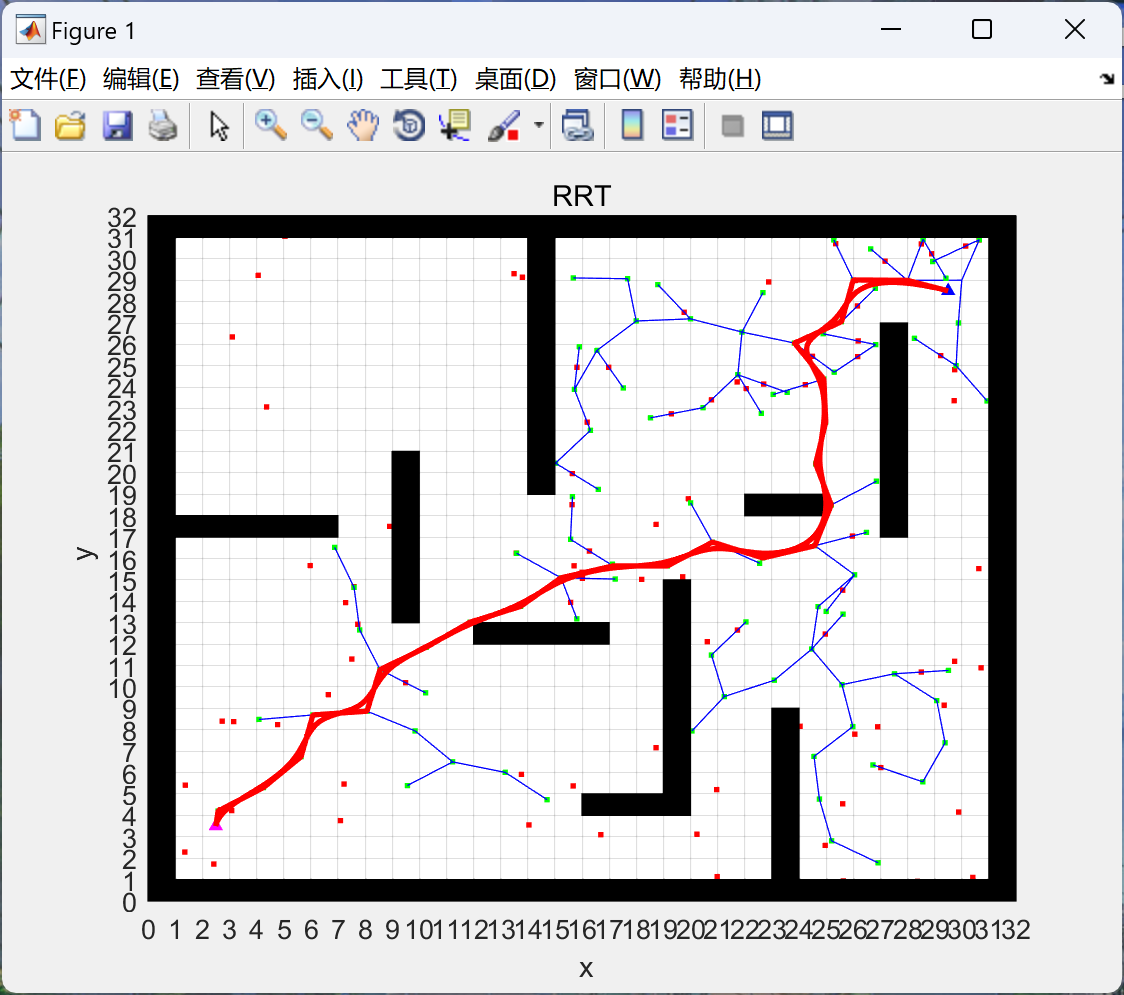 本文介绍了Rapidly-exploringRandomTrees(RRT)算法在处理有障碍物的高维空间中的路径规划,包括工作原理、随机采样与连接策略,以及使用Matlab实现的示例代码。通过实例展示了如何在复杂的环境中寻找可行路径。