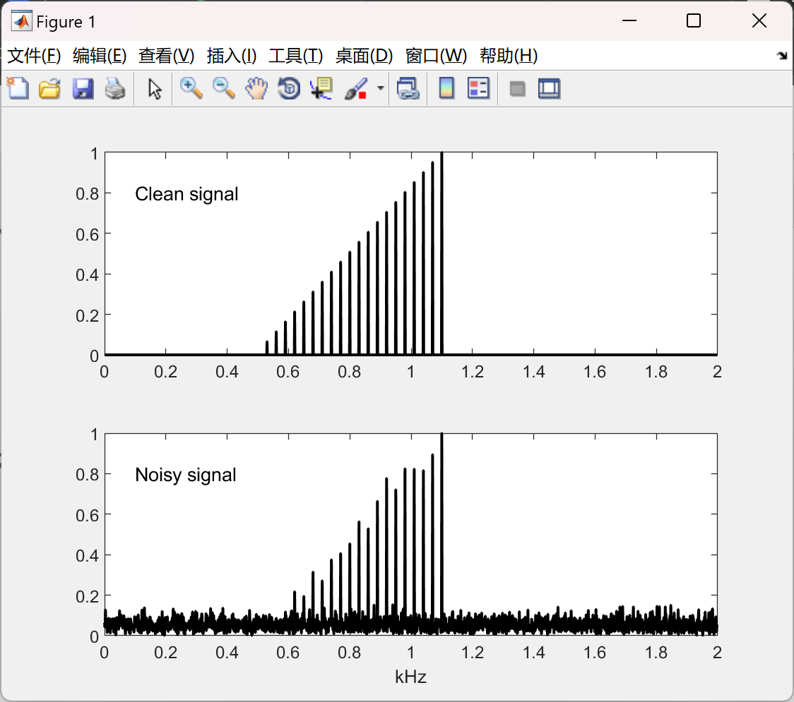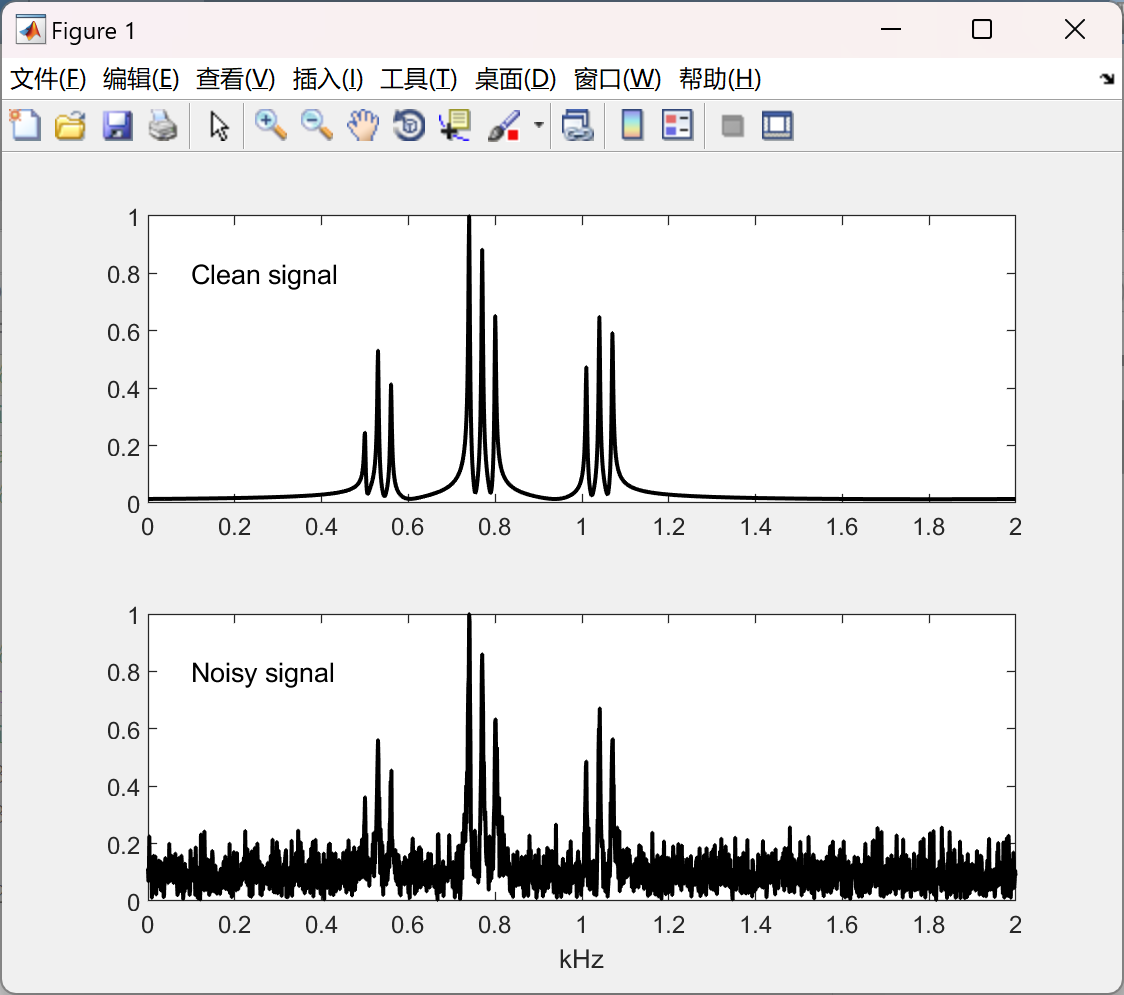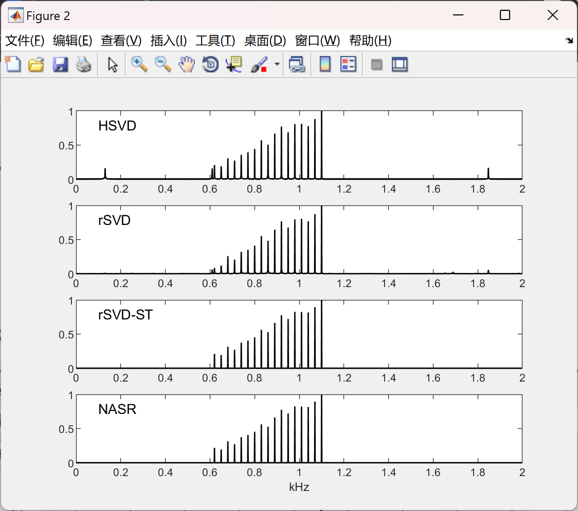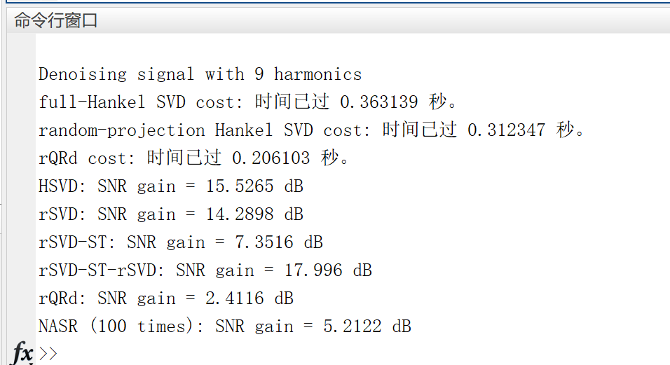 demo_9harmonics.m 展示了对模拟信号(具有9个阻尼谐波)进行去噪的演示。展示了基于五种算法(HSVD、rSVD、rSVD-ST、NASR 和 rQRd)的五个去噪结果。demo_20harmonics.m 展示了对模拟信号(具有20个谐波)进行去噪的演示。展示了基于五种算法(HSVD、rSVD、rSVD-ST、NASR 和 rQRd)的五个去噪结果。demo_pnasData.m 展示了对实验数据(cytoC_ms_1scan_000001.csv)展示了基于四种算法(rSVD、rSVD-ST、NASR 和 rQRd)的四个去噪结果。