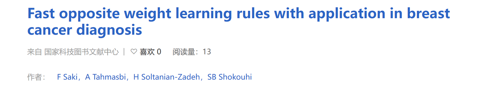 F. Saki, A. Tahmasbi, H. Soltanian-Zadeh, S. B. Shokouhi, Fast opposite weight learning rules with application in breast cancer diagnosis, Comput. Biol. Med., vol. 43, no. 1, pp. 32-41, 2013.
