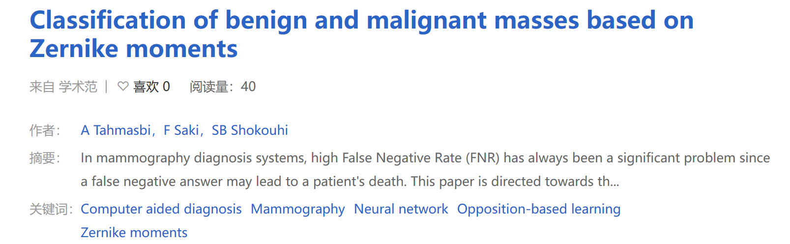 A. Tahmasbi, F. Saki, S. B. Shokouhi, Classification of Benign and Malignant Masses Based on Zernike Moments, Comput. Biol. Med., vol. 41, no. 8, pp. 726-735, 2011.