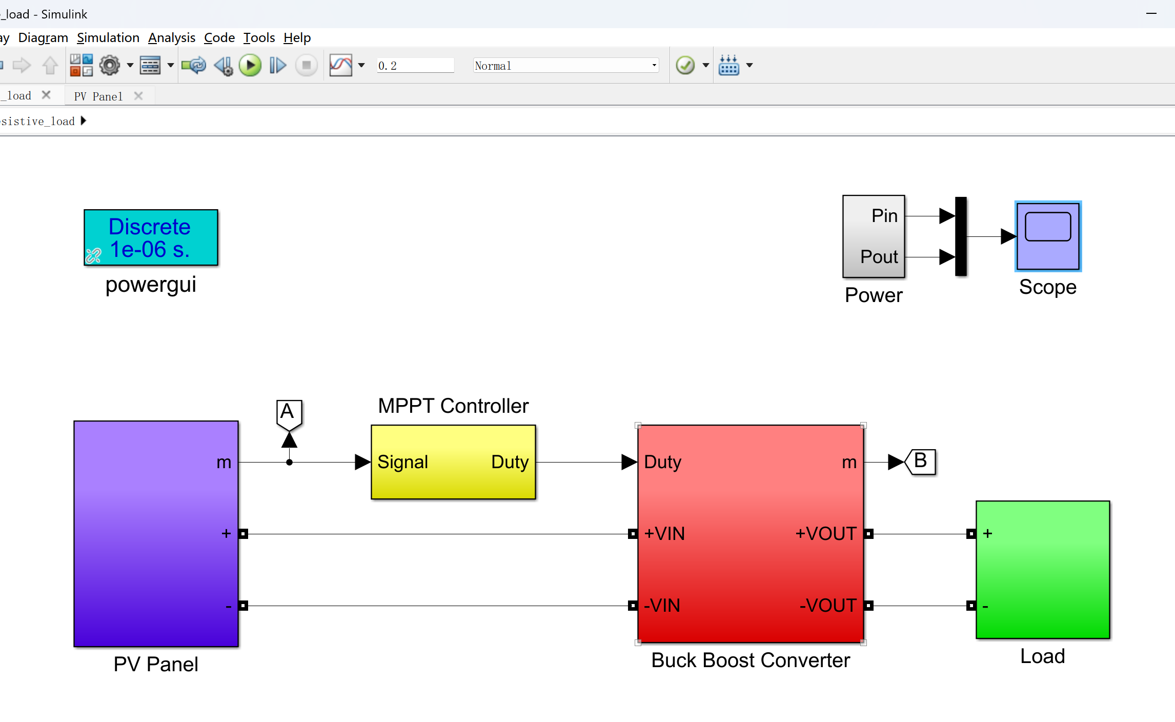 MPPT设备的基本原理是通过不断调节太阳能电池板的工作点,以最大化输出功率。该设备包含电阻负载以及升降压转换器,用于调节输出电压以匹配最大功率点。此外,该设备还模拟了太阳能电池板的电特性,以便更准确地跟踪最大功率点。