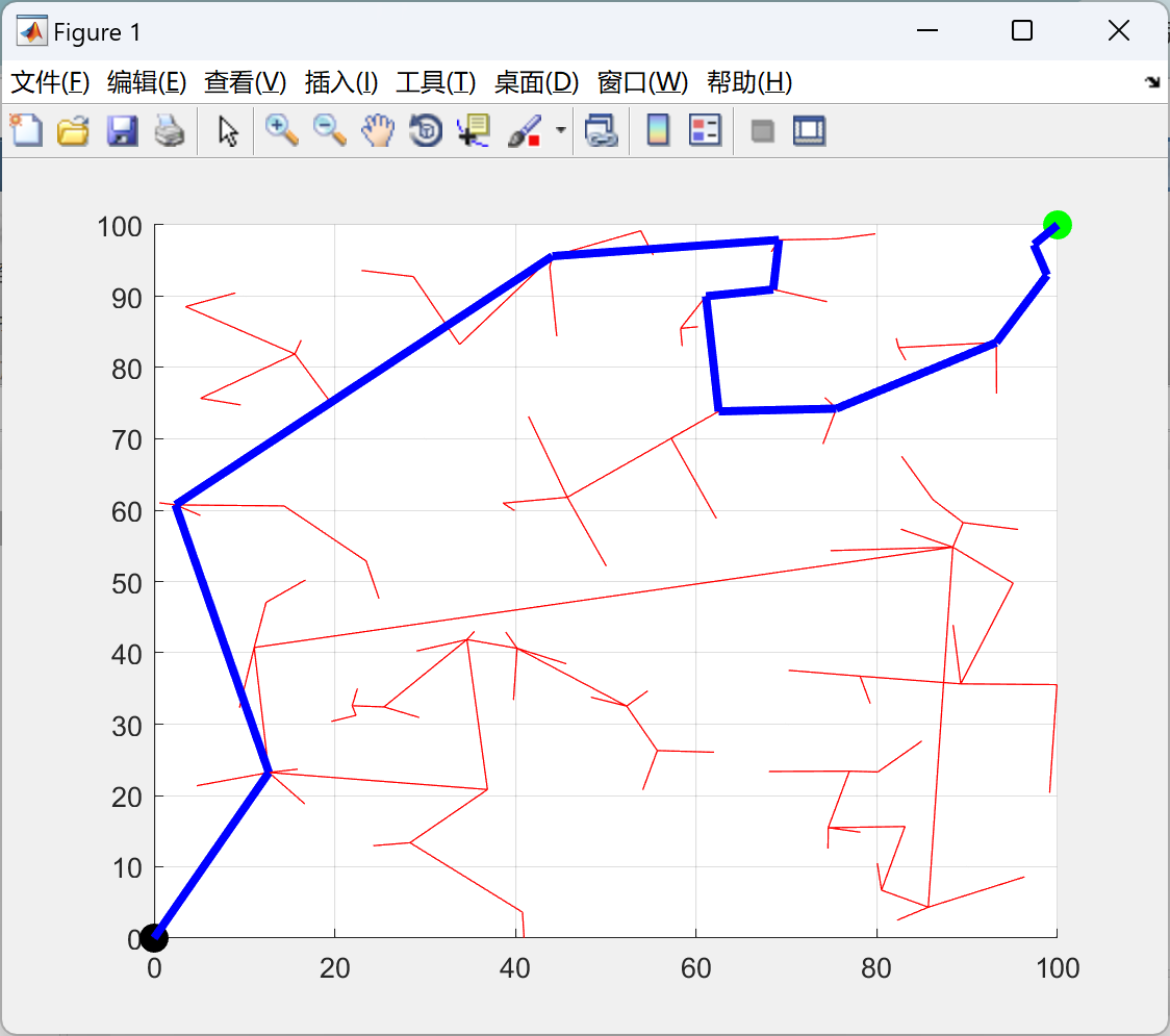 plot([tree.vertex(iter).x; tree.vertex(ind).x],[tree.vertex(iter).y; tree.vertex(ind).y], 'r');