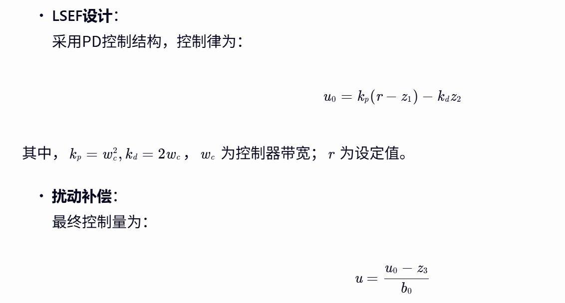 线性跟踪微分器(LTD)的主要作用是对输入信号进行快速、准确地跟踪和微分,为控制系统提供平稳的过渡过程和精确的微分信号;线性扩张状态观测器(LESO)则负责对系统的状态和总扰动进行实时估计,将系统内部的不确定性和外部干扰视为一个总扰动,并通过观测器进行补偿,从而提高系统的鲁棒性;线性状态误差反馈控制律(LSEF)根据系统的状态误差生成控制量,实现对系统的精确控制。