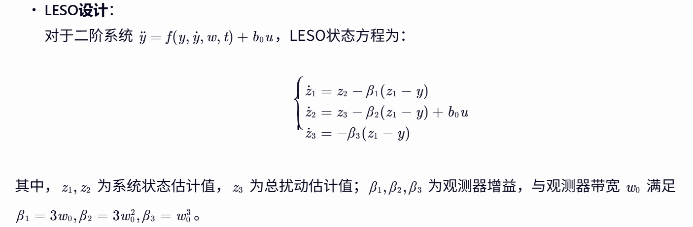 二阶LADRC控制器由线性扩张状态观测器(LESO)、线性误差反馈控制律(LSEF)和扰动补偿环节组成,其核心思想是将系统未建模动态和外部扰动归为“总扰动”,并通过LESO实时估计与补偿。