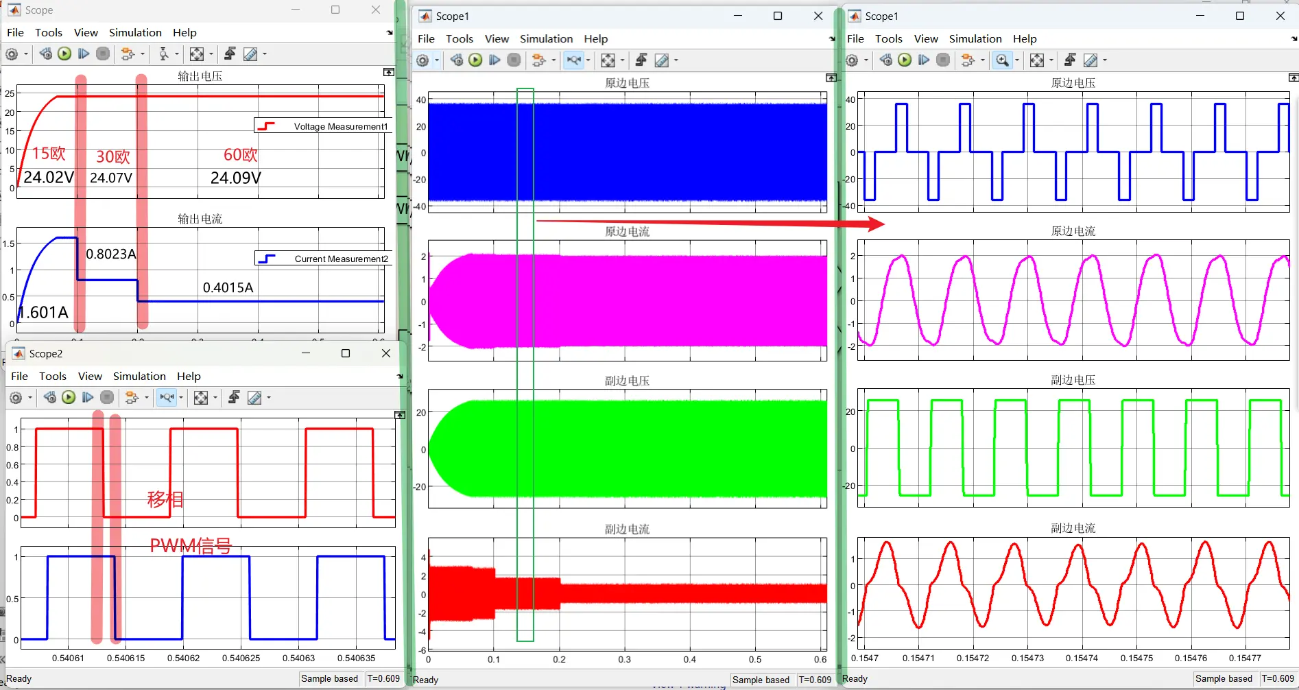 在不同负载条件下,通过移相控制策略调节输出电压,使输出电压稳定在设定值(如28V)。仿真结果表明,在负载电阻从5Ω变化到100Ω的过程中,输出电压波动小于±1%,满足恒压输出要求。