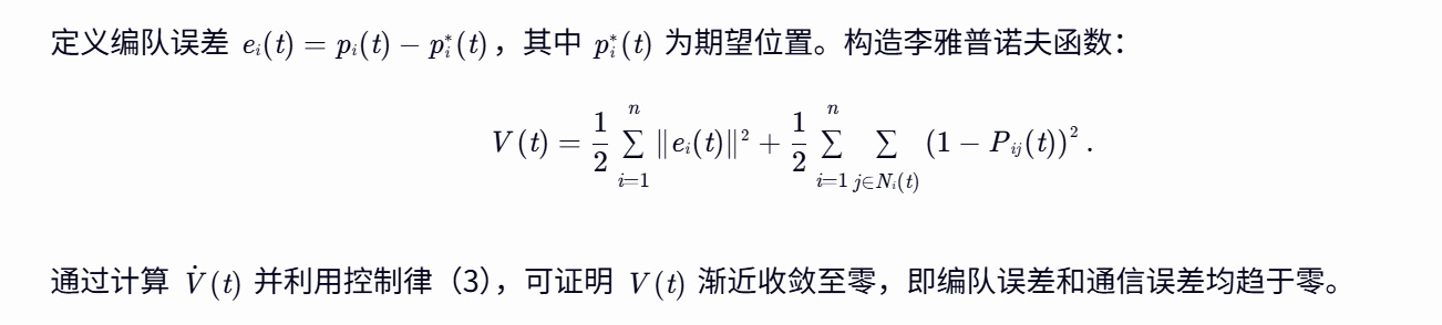 利用非光滑分析工具(如Clarke广义梯度),证明在通信拓扑切换和链路中断情况下,控制律(3)仍能保证编队系统的一致最终有界性(Uniform Ultimate Boundedness, UUB)。