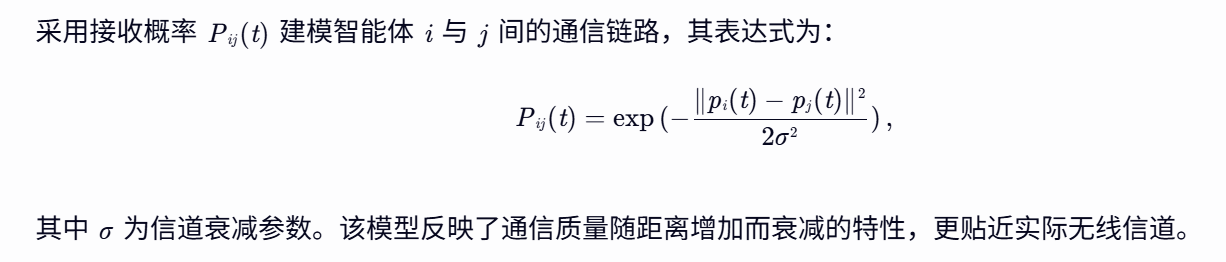 - 理想通信假设:假设通信链路无损耗或仅依赖通信范围,忽略实际信道衰减特性。