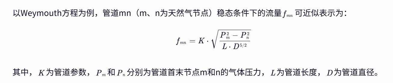 天然气在管道中的流动遵循能量守恒定律。对于高压网络的完全湍流,可类比电力网络的支路功率方程,得到管道稳态条件下的流量方程。常用的管道压力损失方程包括Weymouth方程、Panhandle方程等。