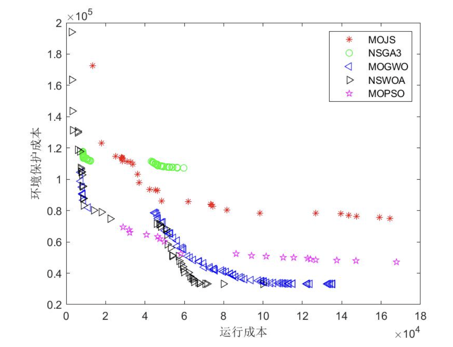 - Pareto前沿分布:NSGA3的解集在目标空间中分布最为均匀,MOPSO的解集在运行成本维度上收敛最快,MOJS的解集在环保性目标上表现突出。