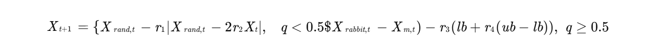 表示猎物第t次迭代时的位置,q和r_1,r_2,r_3,r_4是区间(0,1)内的随机数字,lb是搜索空间的下界,ub是搜索空间的上界,X_{rand,t}表示第t次迭代时哈里斯鹰的随机位置,