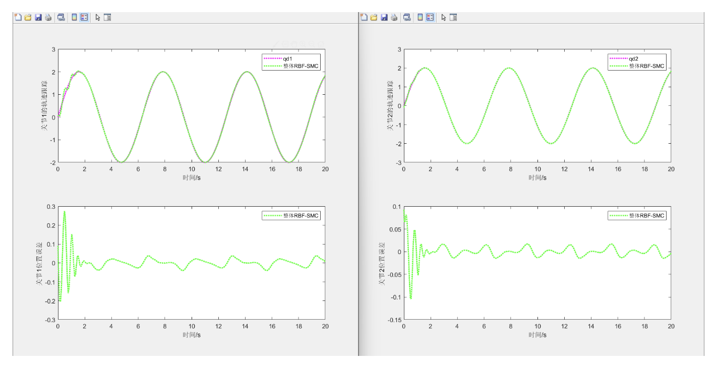 在MATLAB/Simulink环境中构建机械臂模型,结合S函数实现RBF神经网络与滑模控制器的动态交互。仿真参数设置如下:
