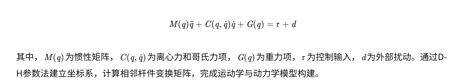 在工业自动化和机器人技术快速发展的背景下,机械臂作为核心执行机构,其轨迹跟踪精度直接影响生产效率与产品质量。然而,机械臂系统存在非线性、强耦合、时变特性,且易受未建模动态、参数变化、摩擦及外部扰动等不确定性因素影响,导致传统控制方法(如PID控制)难以满足高精度轨迹跟踪需求。