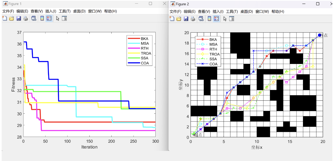 - 路径长度:BKA和COA算法通常能找到较短的路径,因其全局搜索能力强,能有效避免陷入局部最优解。