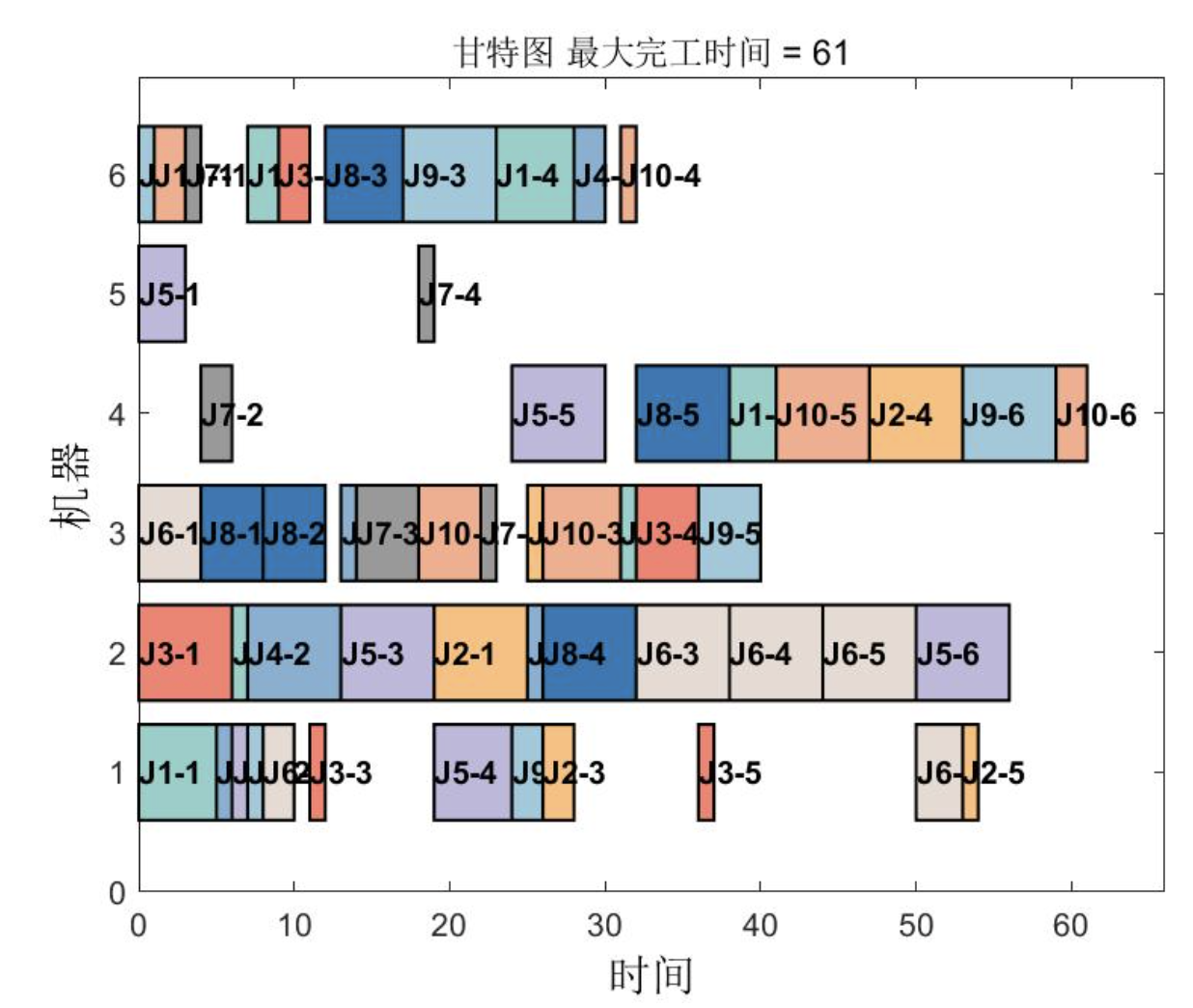 - 根据机器选择的结果和工序的先后约束,生成一个完整的甘特图,直观展示每个工序在每台机器上的加工时间和顺序。