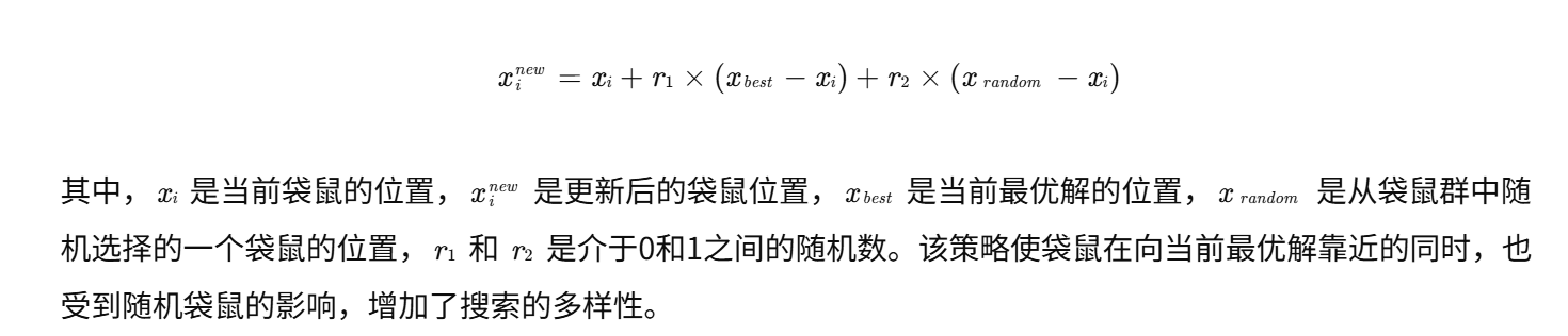 - 更新位置:根据袋鼠的跳跃策略,更新每个袋鼠的位置,模拟袋鼠在环境中的跳跃过程。袋鼠的跳跃方向和距离会受到当前最优解和自身历史信息的影响。