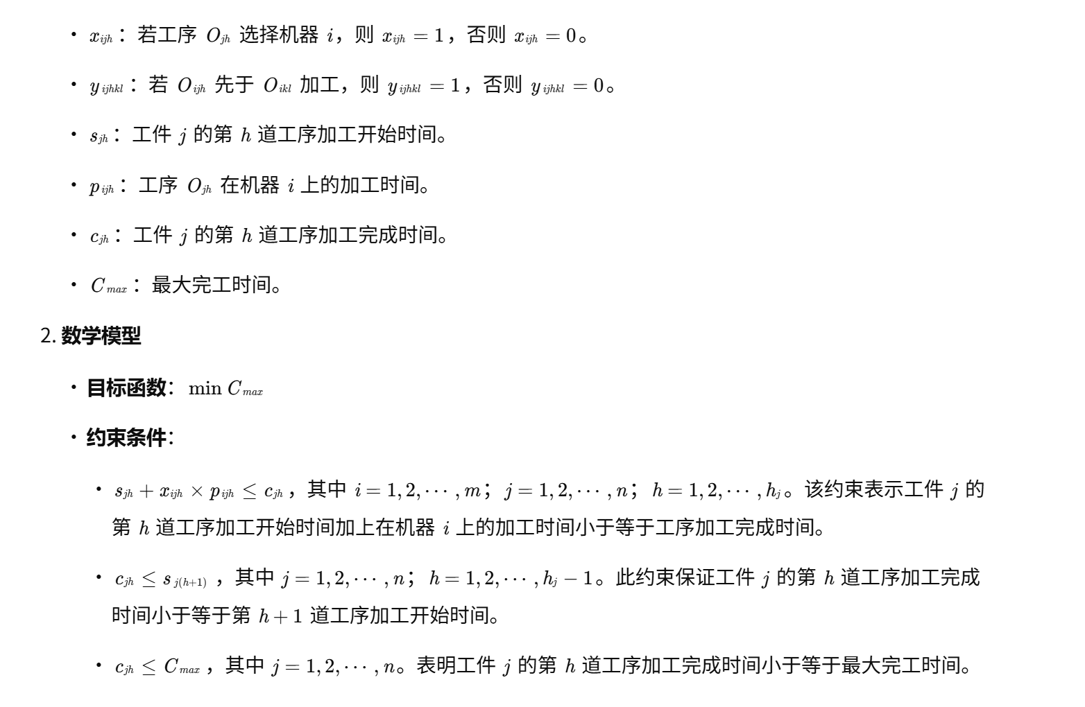 - xijh:若工序 Ojh 选择机器 i,则 xijh=1,否则 xijh=0。