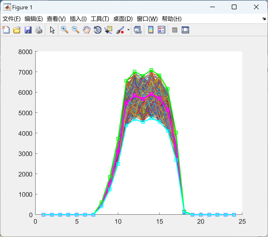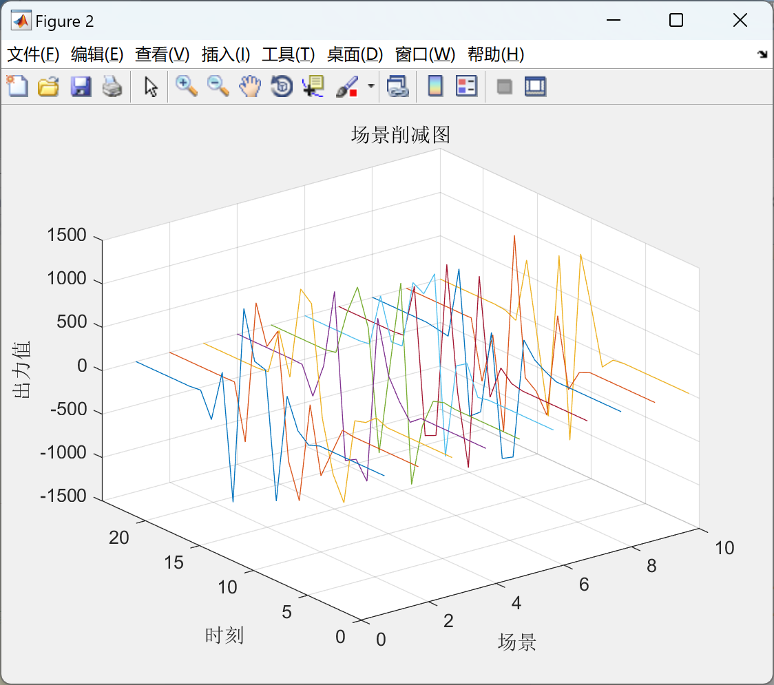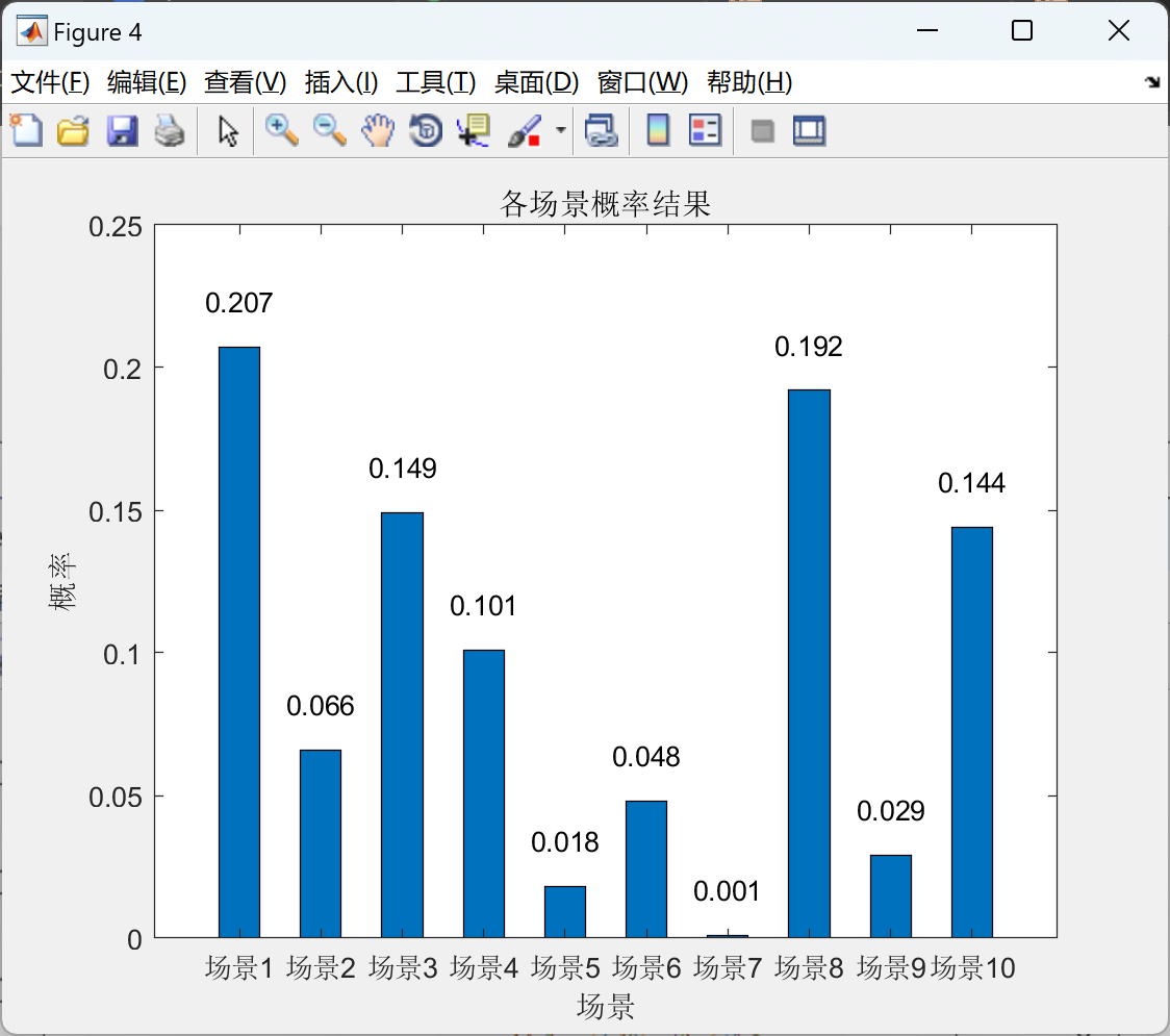 研究表明,光伏发电的不确定性主要由预测误差引起。根据研究结果,这些预测误差(用e表示)符合正态分布,大约占预测出力的10%。为了模拟光伏发电的不确定性,我们采用了拉丁超立方抽样生成场景[1,2],并利用基于概率距离的快速前代消除法对场景进行了缩减[3]。与风电不确定性模拟不同的是,光伏发电可能产生0出力,这可能导致在不确定性模拟中出现超出索引范围的情况。为了解决这个问题,我们对代码进行了相应的调整和优化。