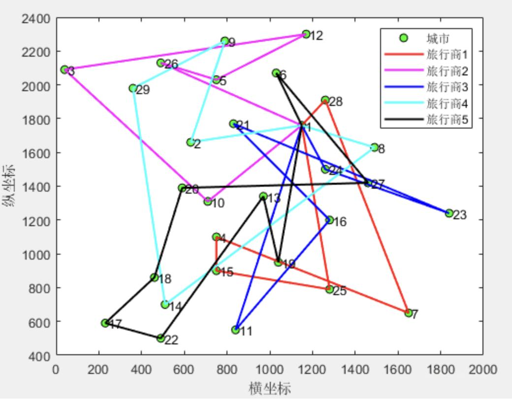 Tnum = 5; % 旅行商个数(可以自行更改) |