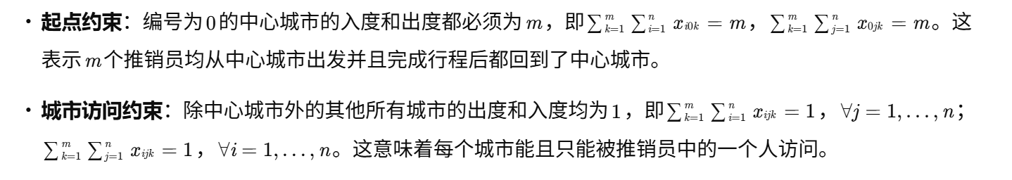 给定一个包含n座城市的城市集合V={0,1,…,n},其中城市0为起点(仓库)。指定m个推销员(旅行商),每个推销员从起点城市出发,访问一定数量的城市,最后回到起点城市。要求除起点城市以外,每一座城市都必须至少被一位推销员访问,并且只能访问一次。