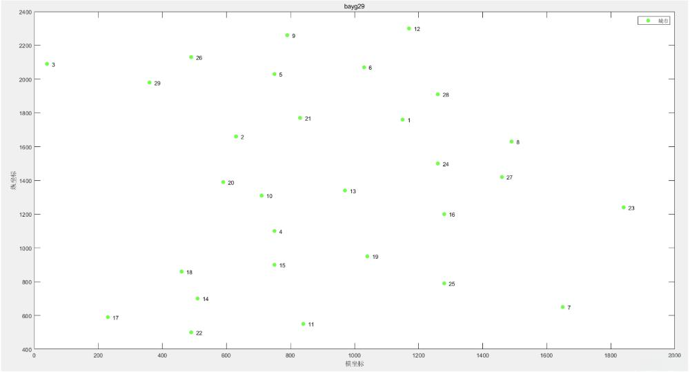load('bayg29_data.mat'); % 假设数据文件中包含城市坐标矩阵coordinates |