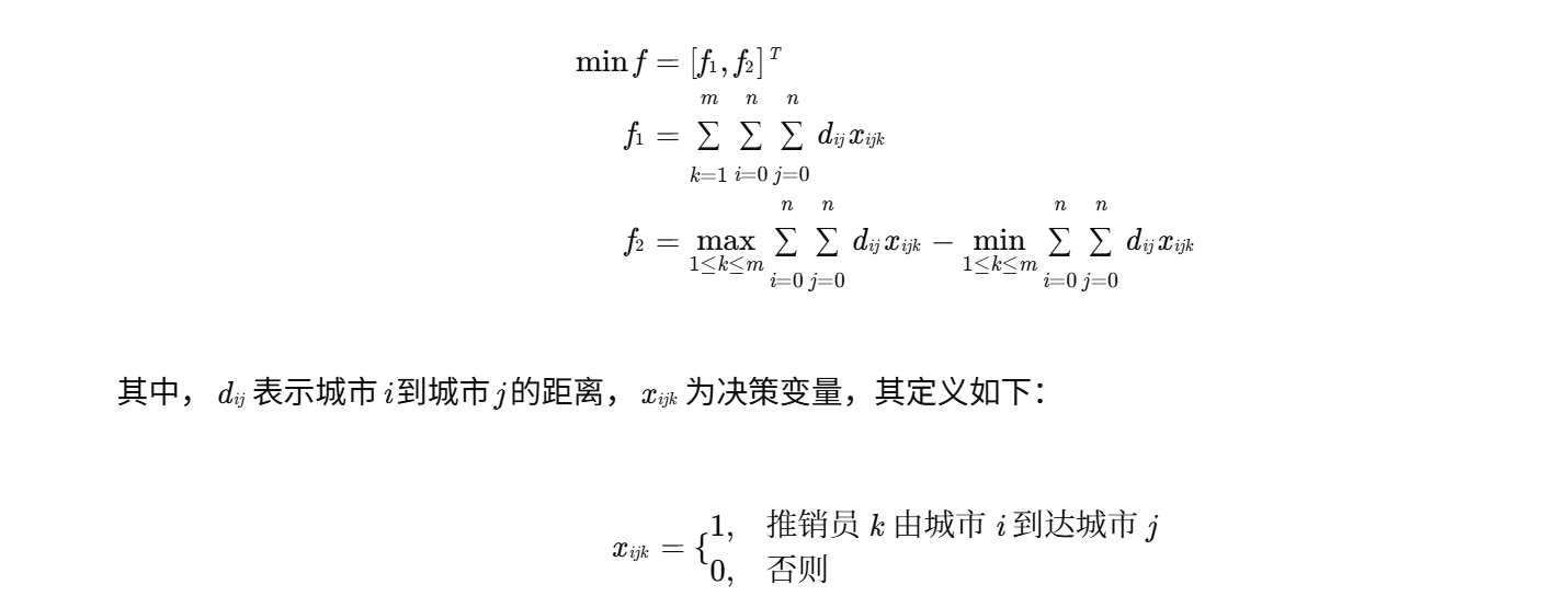 本研究采用双目标优化模型,目标函数分别为所有推销员的总路程f1和推销员中最长路线与最短路线的差值f2(即平衡度)。数学模型表述如下: