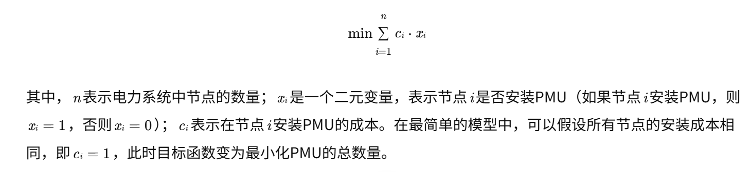目标函数:基于ILP的PMU放置优化模型的目标是最小化PMU的总数量或总成本。目标函数可以表示为: