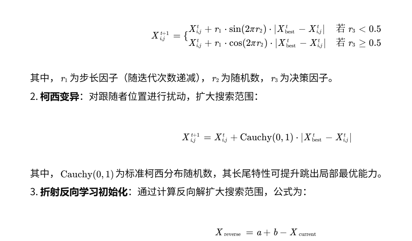 1. 正余弦和柯西变异:正余弦变异和柯西变异是两种常见的变异策略,用于通过对当前种群进行变异操作来生成新的个体。这些变异策略基于数学函数,可以帮助算法快速地在搜索空间中进行探索。