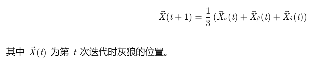 位置更新:根据α、β、δ狼的位置更新其他灰狼个体的位置,公式为: