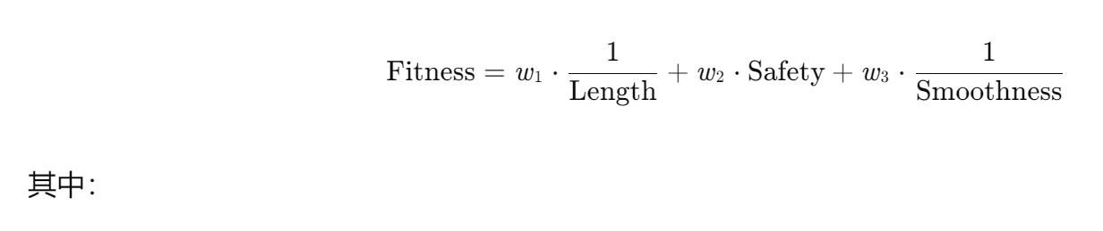 适应度函数综合路径长度、安全性及平滑性指标,定义为: