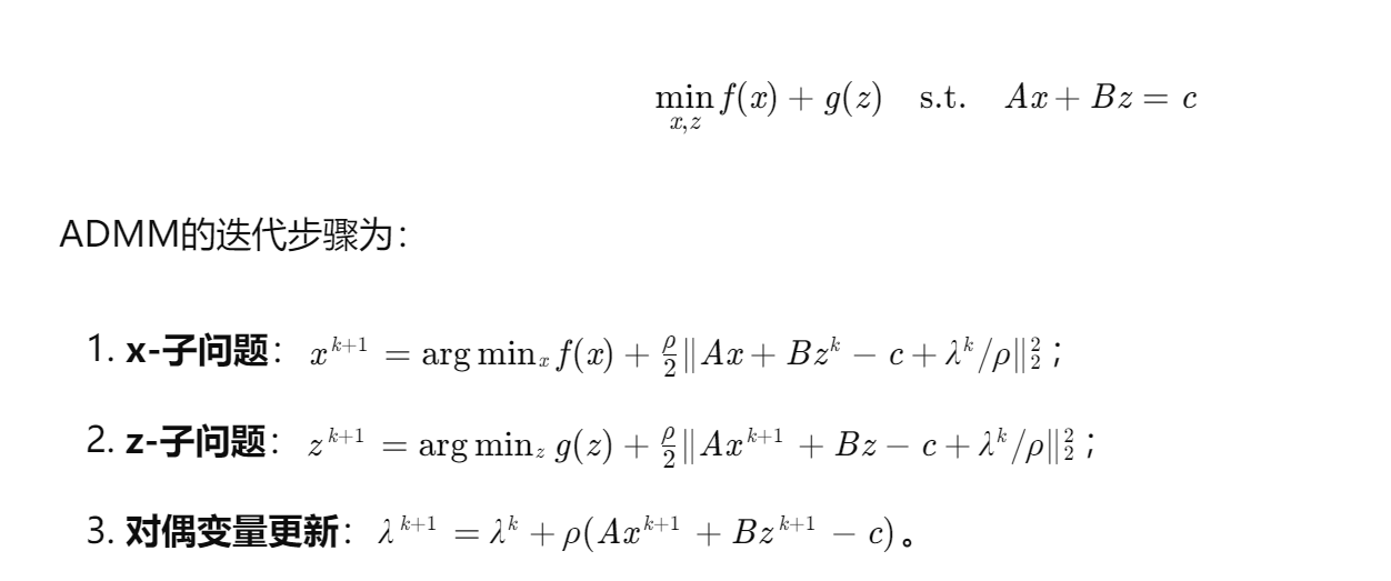 ADMM是一种用于求解带约束凸优化问题的分布式算法,其核心思想是通过引入辅助变量将复杂问题分解为多个简单子问题,并通过交替迭代逼近全局最优解。对于如下优化问题: