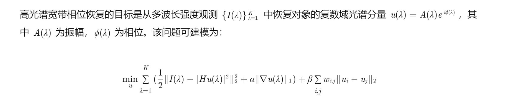 - 病态逆问题:强度观测 I(λ)=∣Hu(λ)∣2 丢失相位信息,导致解不唯一;