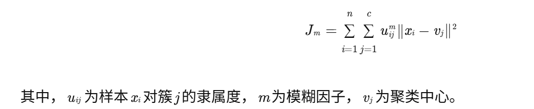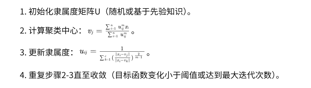 FCM通过迭代更新隶属度矩阵U和聚类中心V,最小化目标函数: