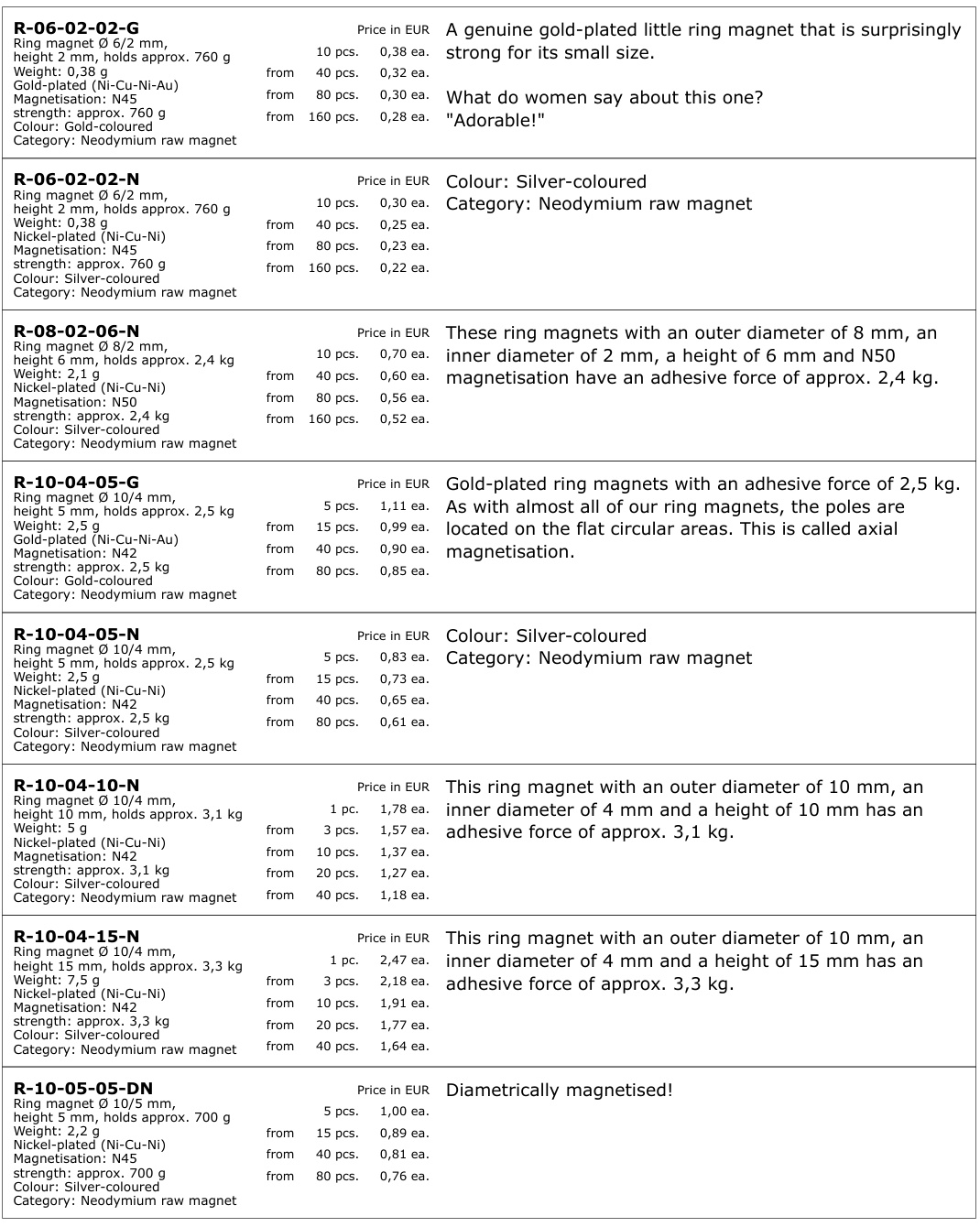 型号示例 外径/内径/高度 磁化强度 磁力 应用场景 R-06-02-02 6 mm/2 mm/2 mm N45 0.38g 微型传感器(小空间) R-10-05-05 10 mm/5 mm/5 mm N50 2.5 kg 工业电机(高负载)