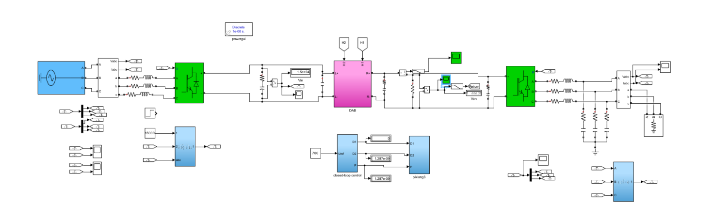 输入级三相交流电压10kV,频率为50Hz,双闭环控制输出15kV;中间级输入15kV输出700V;输出级三相逆变器输出380V交流电。开关频率20k。仿真时间0.3s。