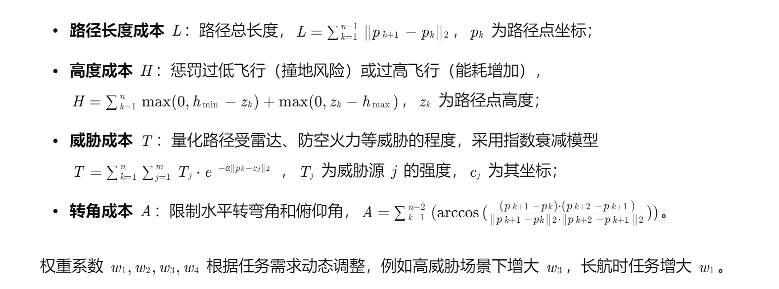 - 路径总成本:综合路径长度、高度、威胁和转角成本;