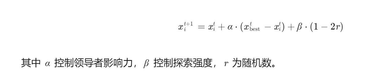 位置更新策略:结合开发项(向领导者移动)和探索项(随机扰动),公式为:
