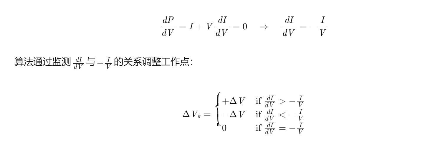 IncCond算法通过比较电压与电流的导数关系判断工作点位置。根据光伏P-V曲线特性,MPP处满足: