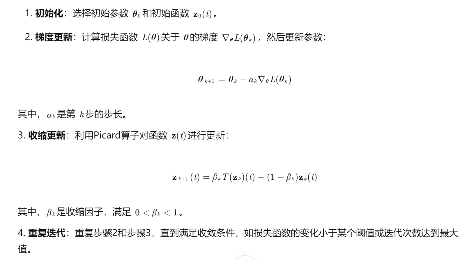 利用Picard算子的收缩性质,我们设计了一类“梯度 - 收缩”算法来求解上述约束优化问题。该算法的基本思想是在每一步迭代中,先沿着损失函数的负梯度方向更新参数 θ,然后利用Picard算子的收缩性质对函数 z(t)进行更新,使其更接近Picard算子的不动点。