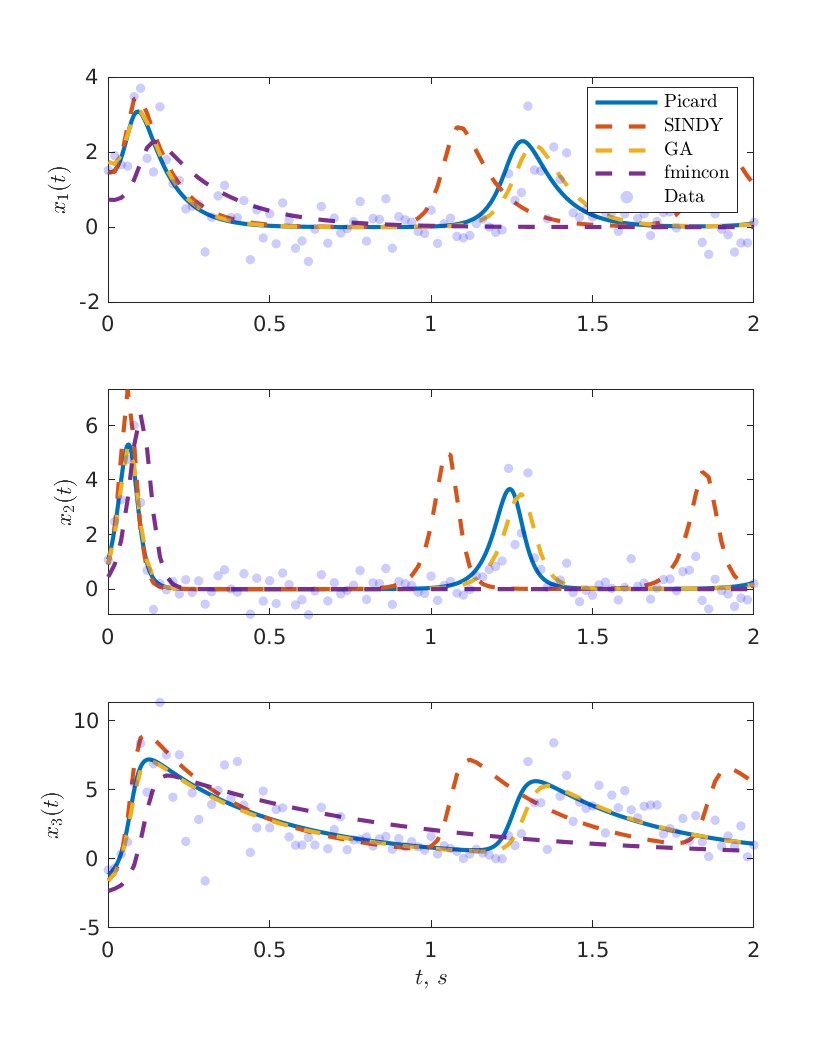 摘要:本文聚焦于利用实验时间序列数据对非线性常微分方程进行参数估计这一复杂问题,着重应对数据含噪、稀疏、非均匀采样、包含多组实验且无法直接测量系统状态或其时间导数等低质量数据所带来的挑战。提出了一种基于梯度的参数估计框架,借助Picard算子将原问题重构为含无限维变量与约束的约束优化问题。利用Picard算子的收缩性质设计了“梯度 - 收缩”算法,并给出算法收敛到局部最优的充分条件。通过在多种模型与数据集上的系统测试,验证了该算法的鲁棒性,且证明其相较于现有方法具有显著改进。