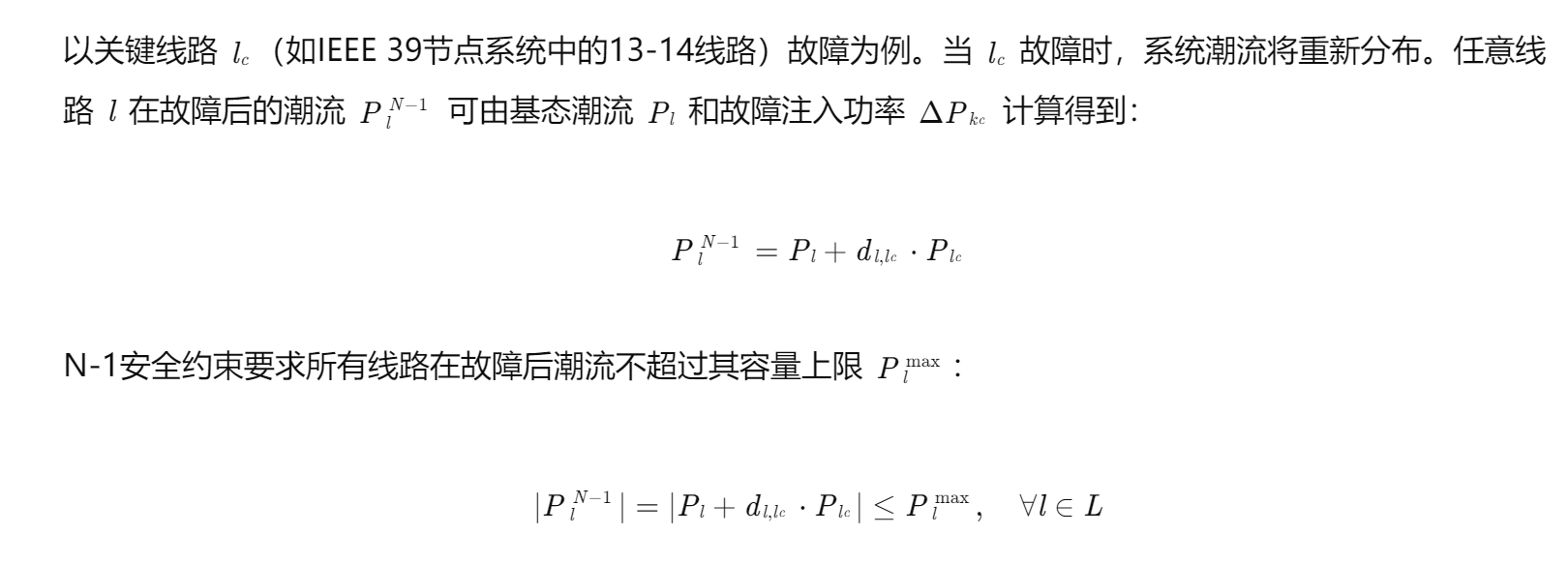 为保证电网的物理安全,调度方案必须满足N-1静态安全准则,即系统中任意一条线路故障,其余线路不会发生过载。