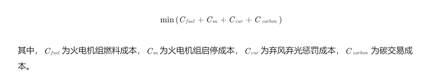 本模型的目标是最小化系统在单个调度周期内的总运行成本,主要包括火电机组的燃料成本、启停成本、新能源弃风弃光惩罚成本以及碳交易成本。目标函数可表示为: