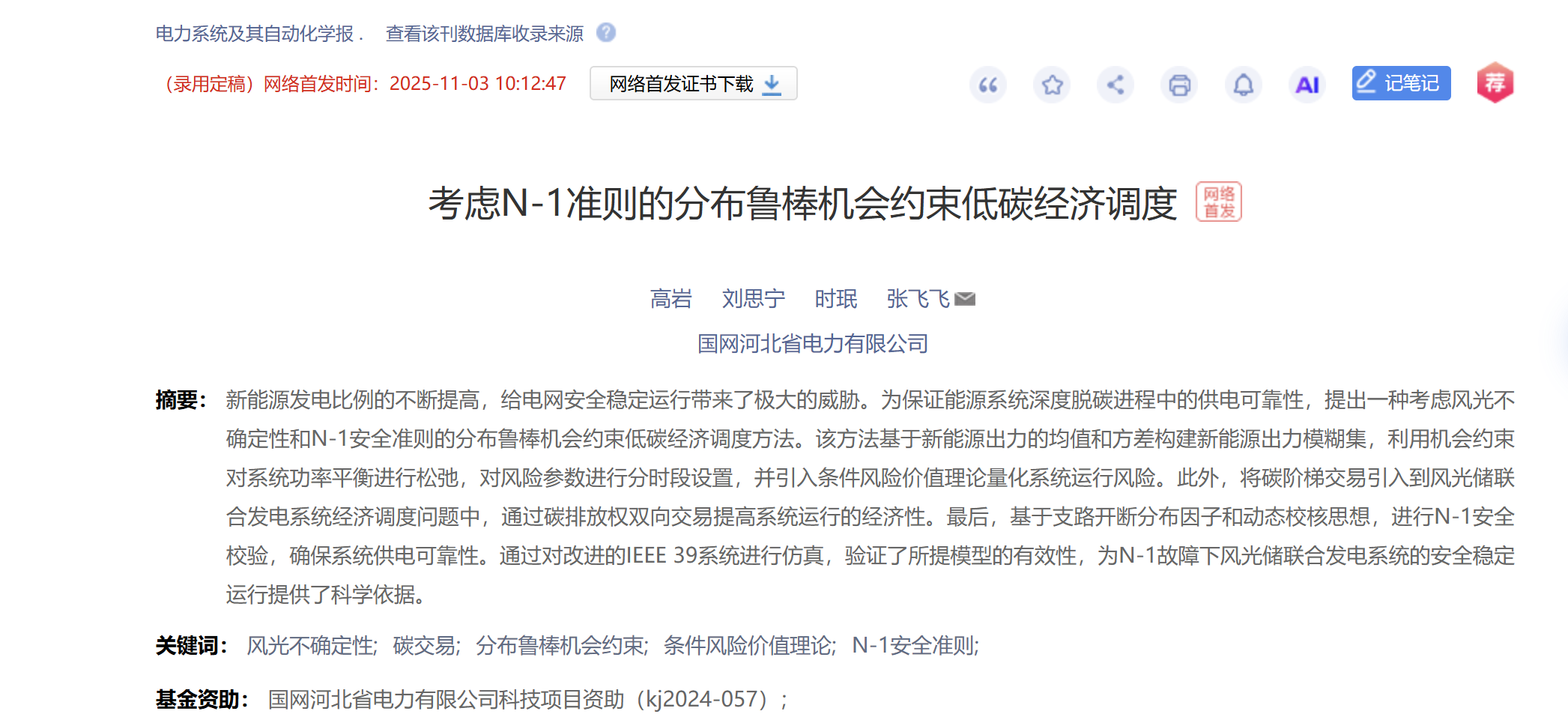 [1]高岩,刘思宁,时珉,等.考虑N-1准则的分布鲁棒机会约束低碳经济调度[J/OL].电力系统及其自动化学报,1-11[2025-11-16].https://doi.org/10.19635/j.cnki.csu-epsa.001717.