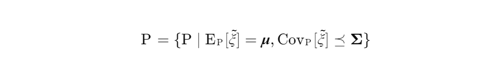 设风、光出力的预测值向量为 μ,其协方差矩阵为 Σ。我们构建一个均值-方差模糊集 P,其中包含所有均值和协方差与 (μ,Σ) 相近的概率分布: