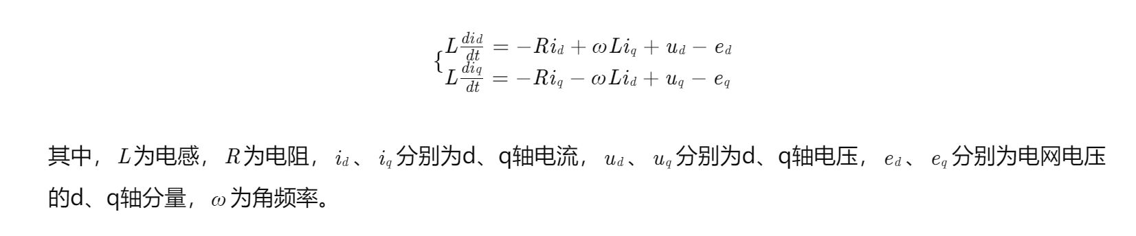电压电流双环控制是三相虚拟同步发电机控制策略的重要组成部分,其作用是改善系统输出电能质量,提高系统动态特性。在三相电压型逆变器中,通常采用电压矢量定向控制方法。首先建立VSC在d - q旋转坐标系下的数学模型: