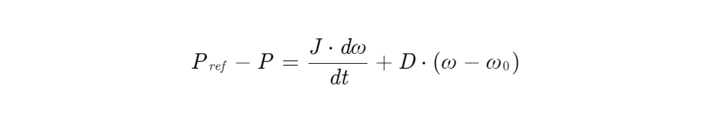 其中,Pref为有功功率参考值,P为实际输出有功功率,J为虚拟惯量,ω为角频率,ω0为额定角频率,D为阻尼系数。该方程描述了有功功率偏差与角频率变化之间的关系,通过调整虚拟惯量J和阻尼系数D,可以改变系统的动态响应特性。
