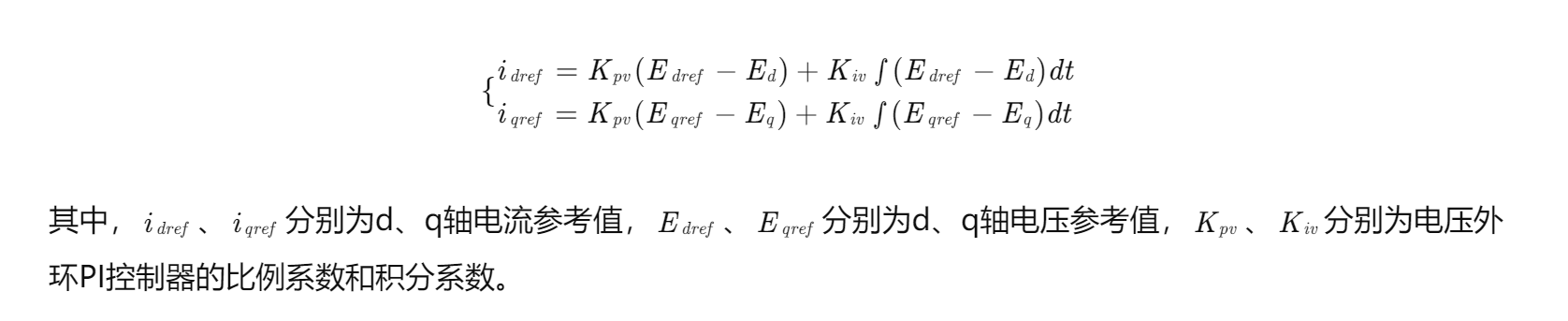 基于上述数学模型,设计电压电流双环控制器。电压外环以功率环输出的电压参考值为输入,通过PI控制器生成电流参考值,其控制方程为: