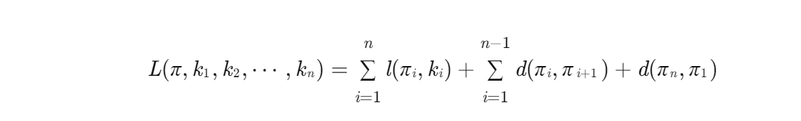 则整个路径的总长度L(π,k1,k2,⋯,kn)为: